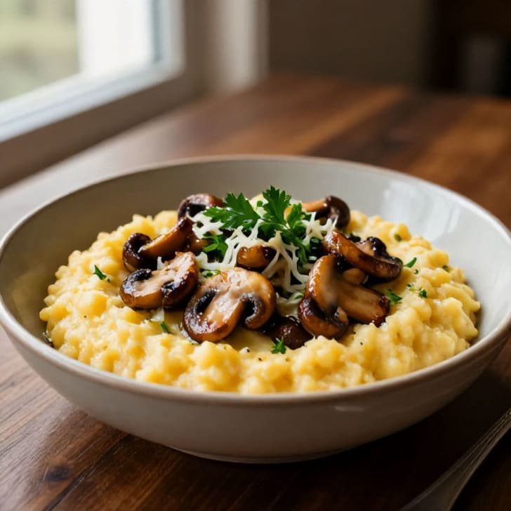 Die cremige Gouda-Polenta auf zwei Schüsseln verteilen. Reichlich mit den gebratenen Pilzen belegen und mit frischer Petersilie garnieren. Sofort servieren.
