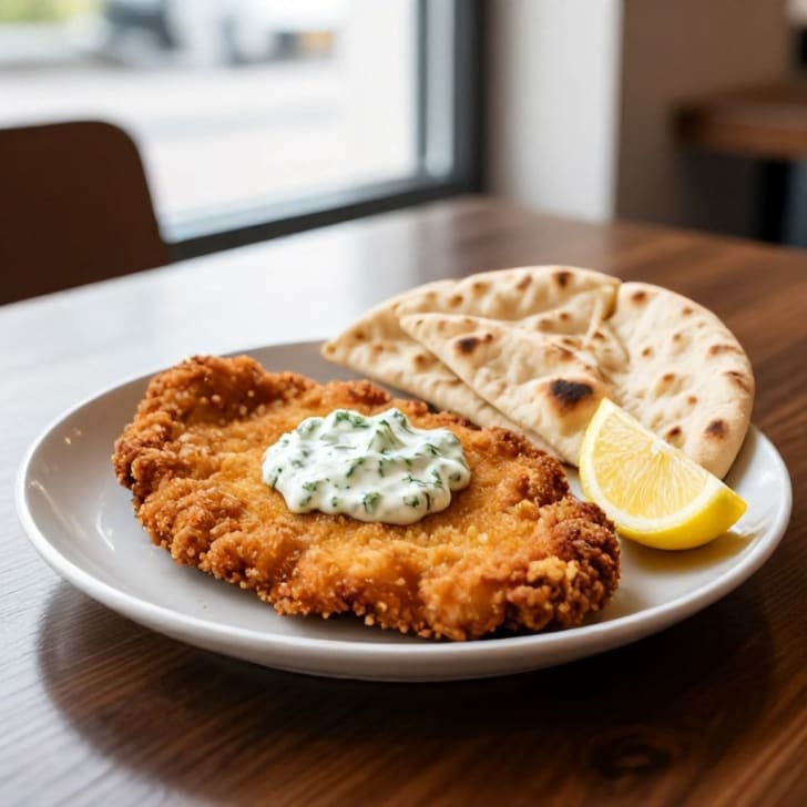 Das Fladenbrot nach Packungsanleitung erwärmen (z.B. kurz im Ofen oder Toaster). Die knusprigen Schnitzel sofort mit der cremigen Kräutersoße, warmem Fladenbrot und einer Zitronenspalte servieren.
