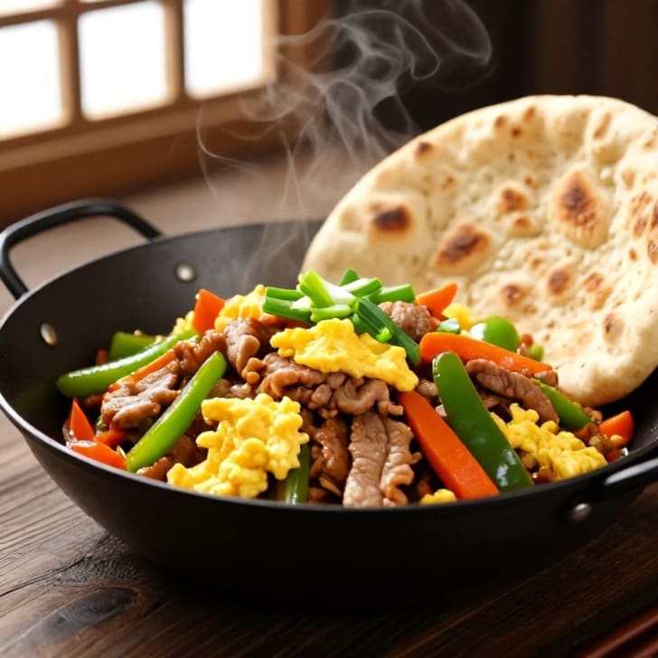 Das Fladenbrot in Spalten schneiden. Den herzhaften Schweinefleisch-Rührei-Wok sofort mit warmem Fladenbrot servieren, garniert mit den grünen Teilen der Frühlingszwiebeln.