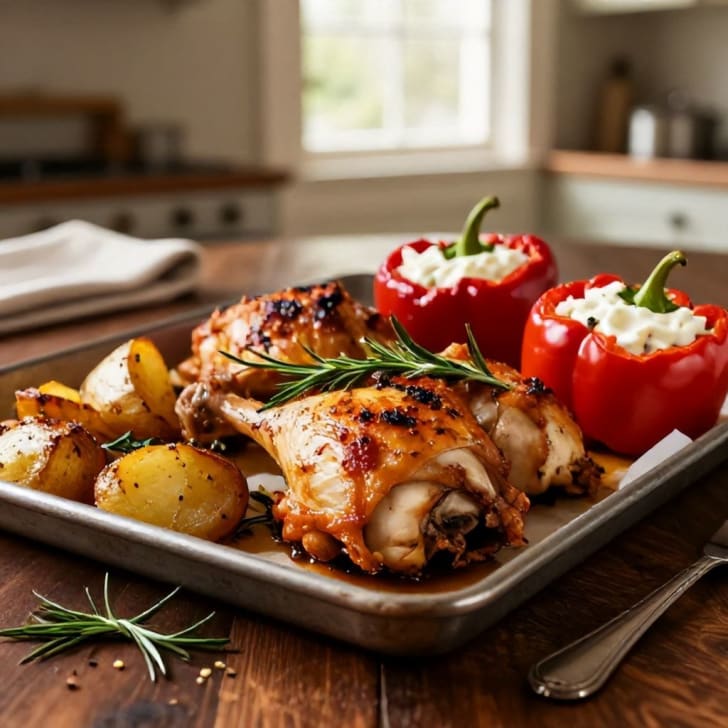 Ein gemütliches und einfach zuzubereitendes Abendessen mit saftigen gebratenen Hendl-Keulenvierteln, knusprigen Rosmarinkartoffeln und süßen, mit Frischkäse gefüllten Peppersweet. Dieses vollwertige Gericht ist perfekt für einen entspannten Abend. Die süß-saure Frischkäsefüllung der Peppersweet bietet einen herrlichen Kontrast zum herzhaften Hähnchen und den erdigen Rosmarinkartoffeln und sorgt für einen ausgewogenen und geschmackvollen Bissen!