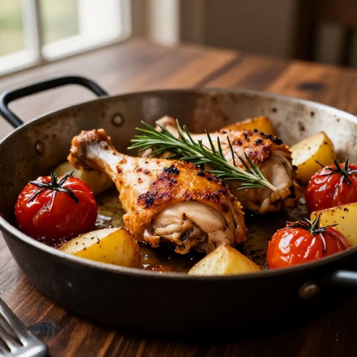 Diese lebendige mediterrane Hähnchen-Pfanne vereint zartes Hähnchen, geröstete Kartoffeln und süße Pflaumentomaten, alles aromatisch mit Rosmarin verfeinert. Ein gesundes, geschmackvolles und einfaches Ein-Pfannen-Gericht, ideal für ein Abendessen unter der Woche.