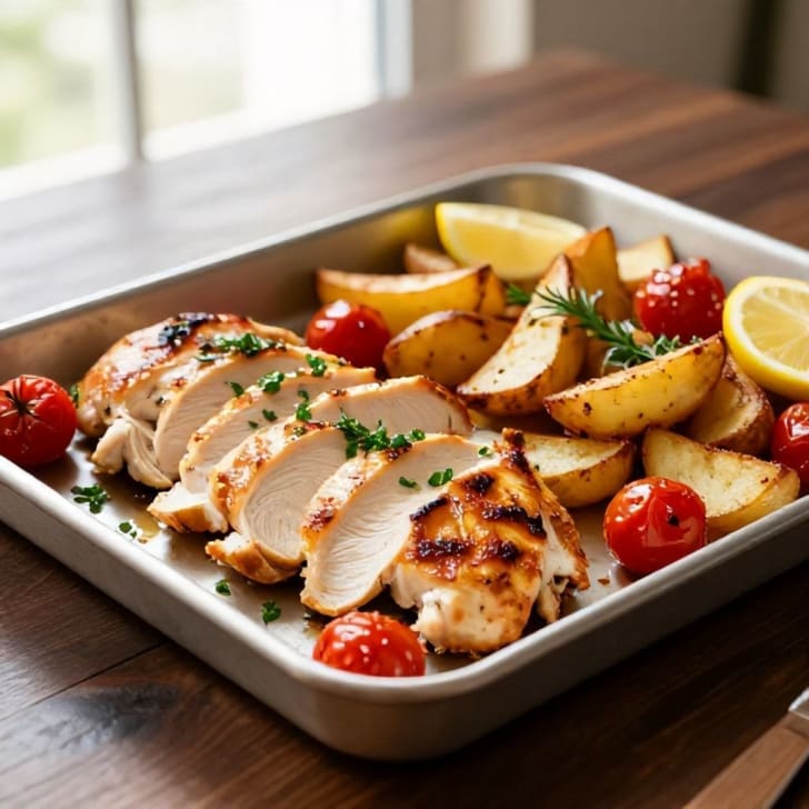 Nach 15 Minuten das gewürzte Hähnchen und die ganzen Kirschtomaten zu den Kartoffeln auf das Backblech geben. Vorsichtig vermischen.