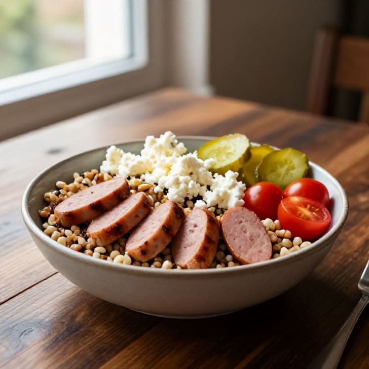 Den gekochten Getreidemix auf zwei Schüsseln verteilen. Mit den gebratenen Käsekrainer-Scheiben, halbierten Kirschtomaten und geschnittenen Gurken belegen.