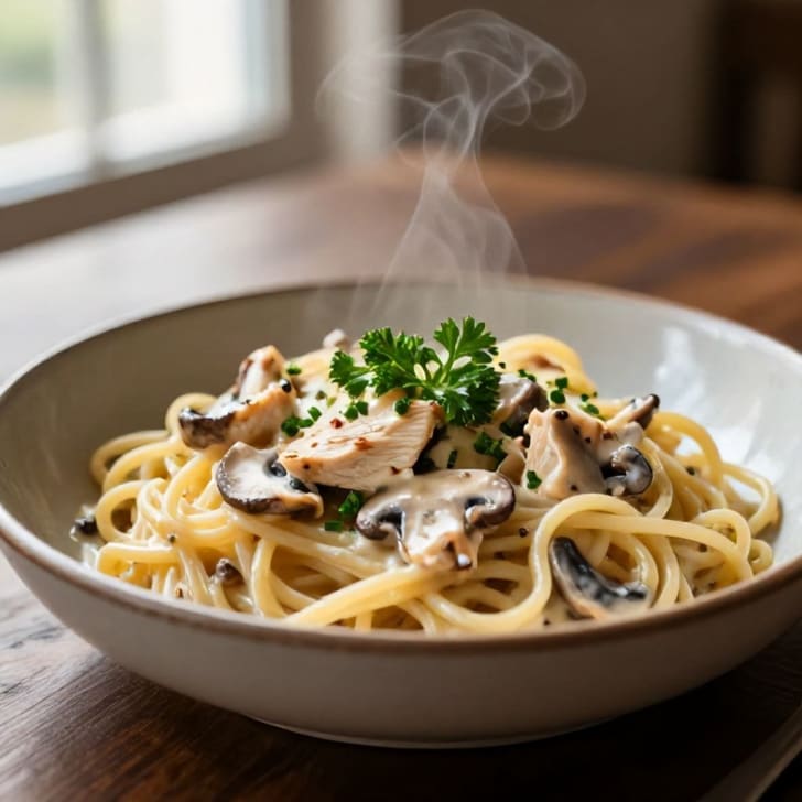 Hähnchen zurück in die Pfanne geben. Gekochte Linguine hinzufügen und alles vermischen, sodass alles mit der cremigen Sauce überzogen ist. Mit Salz und Pfeffer abschmecken.