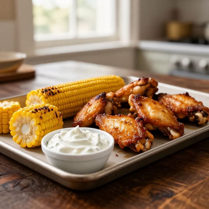 Knusprig gebackene, perfekt gewürzte Hähnchenflügel, serviert mit süßem geröstetem Maiskolben und einem erfrischenden, cremigen Tzatziki-Dip. Ein schmackhaftes und einfaches Abendessen unter der Woche.