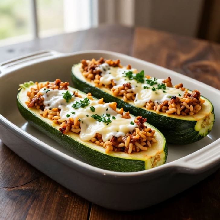 Die Zucchinihälften großzügig mit der Faschiertem-Reis-Mischung füllen. Die gefüllten Zucchini-Boote in eine Auflaufform legen.