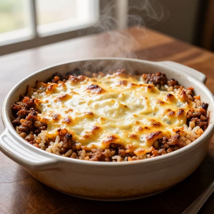 Dieser wärmende Auflauf kombiniert gewürztes Hackfleisch mit lockerem Reis und einer reichhaltigen, geschmolzenen Mondseer Käse-Auflage. Ein einfach zuzubereitendes Abendessen, perfekt für einen gemütlichen Abend.