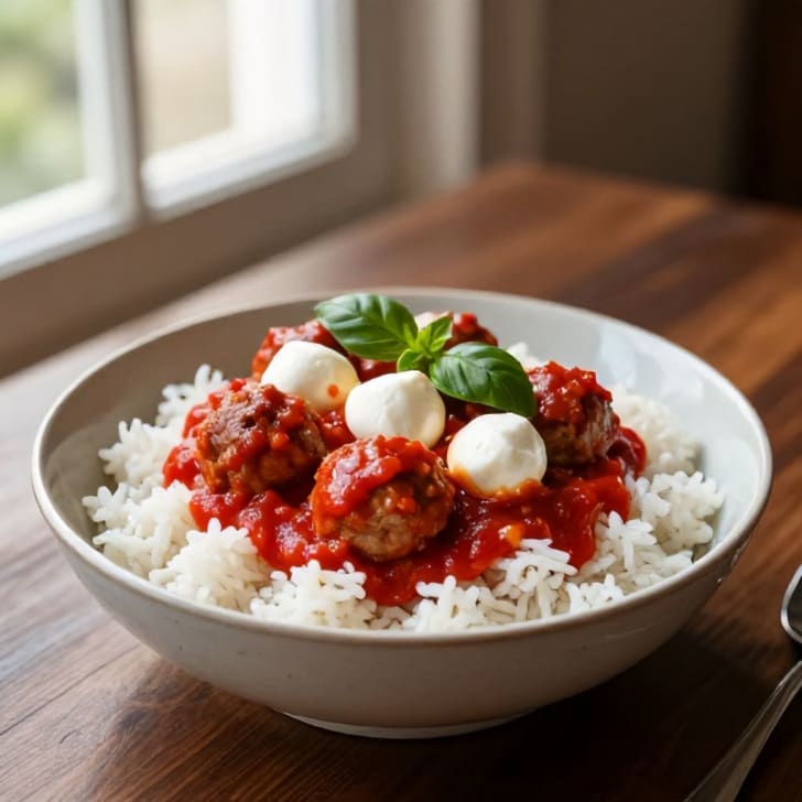 Die Hackfleischbällchen und Tomatensauce über dem Jasminreis servieren. Mit frischen Mozzarella Minis garnieren.