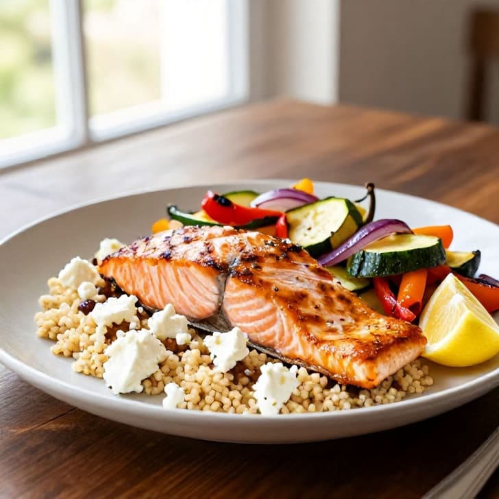 Die Ziegenkäsebällchen zerbröseln. Den gerösteten Lachs und das Gemüse über dem Couscous anrichten und großzügig mit dem zerbröselten Ziegenkäse bestreuen.