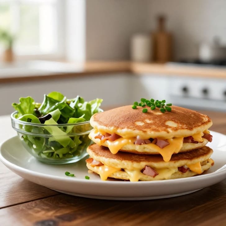 Die warmen herzhaften Pfannkuchen sofort mit dem frischen grünen Salat servieren.