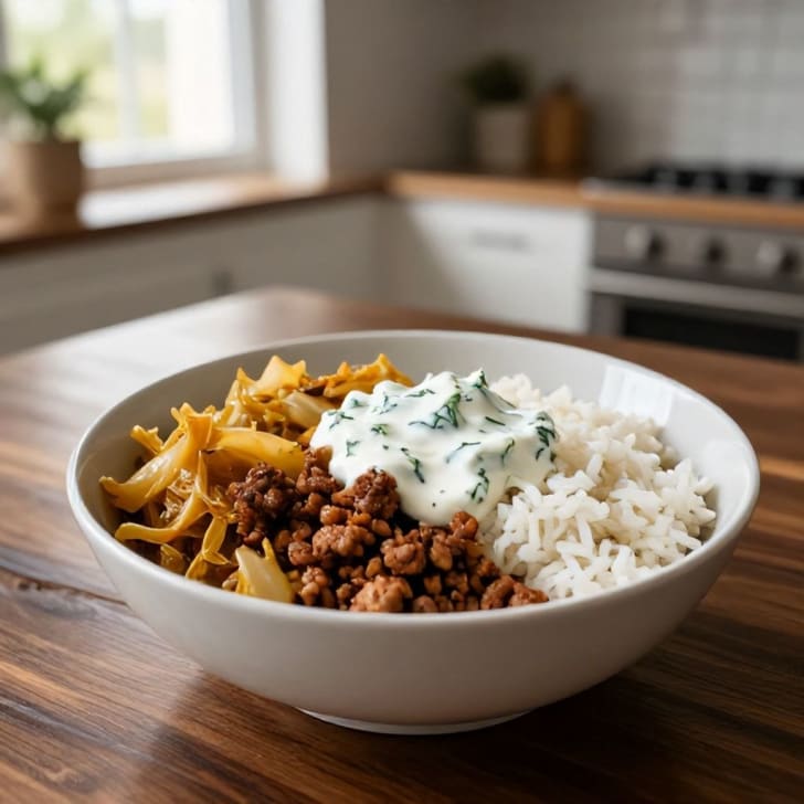 Zum Anrichten den gekochten Reis auf zwei Schüsseln verteilen. Mit der herzhaften Faschiertes-Mischung und dem warmen Kraut belegen. Großzügig mit dem würzigen Joghurt-Dressing beträufeln. Sofort servieren.