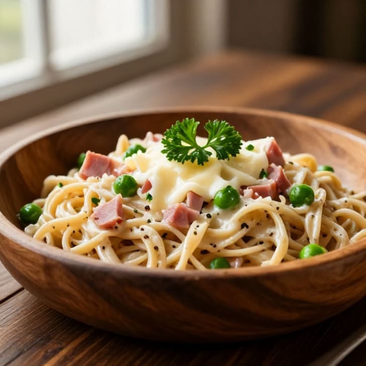 Dieses wohltuende Pastagericht kombiniert zarte Dinkelpasta mit herzhaftem Schinken, süßen Erbsen und reichhaltigem Bergkäse in einer cremigen Sauce. Es ist ein schnelles, sättigendes und gesundes Abendessen unter der Woche, das Ihre Geschmacksknospen begeistern wird.