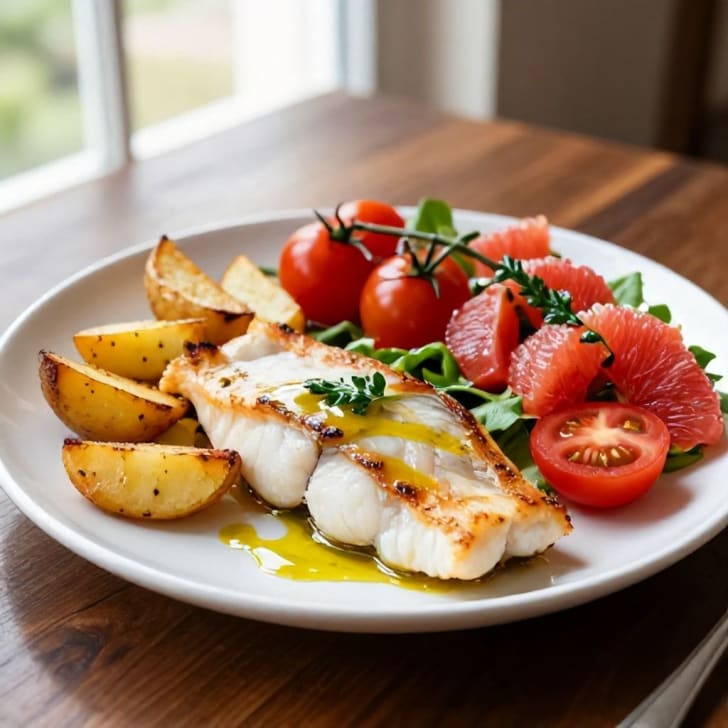 Den gebackenen Seelachs und die Röstkartoffeln mit dem frischen Tomaten-Grapefruit-Salat servieren.