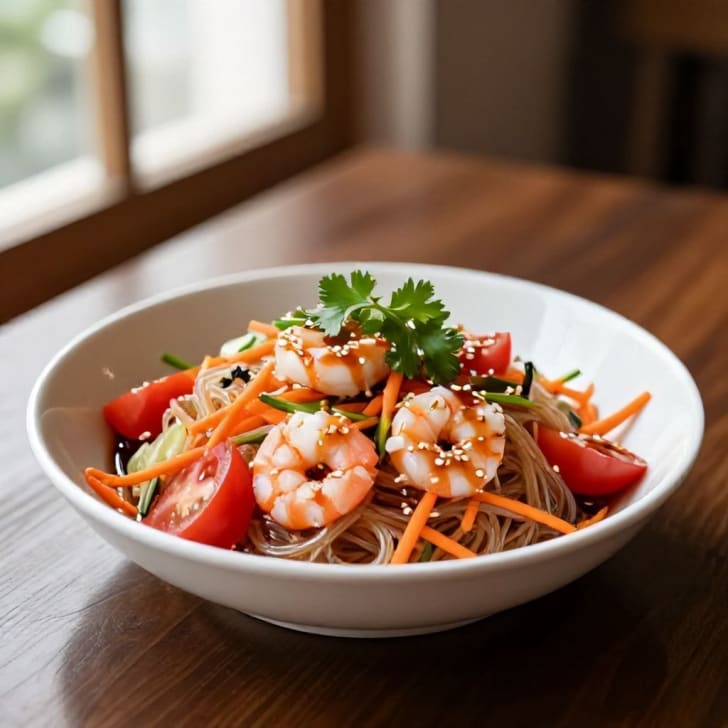 In einer großen Schüssel die gekochten Glasnudeln, die gebratenen Garnelen, die halbierten Tomaten, die Julienne-Karotten und den geschnittenen Sellerie vermischen.