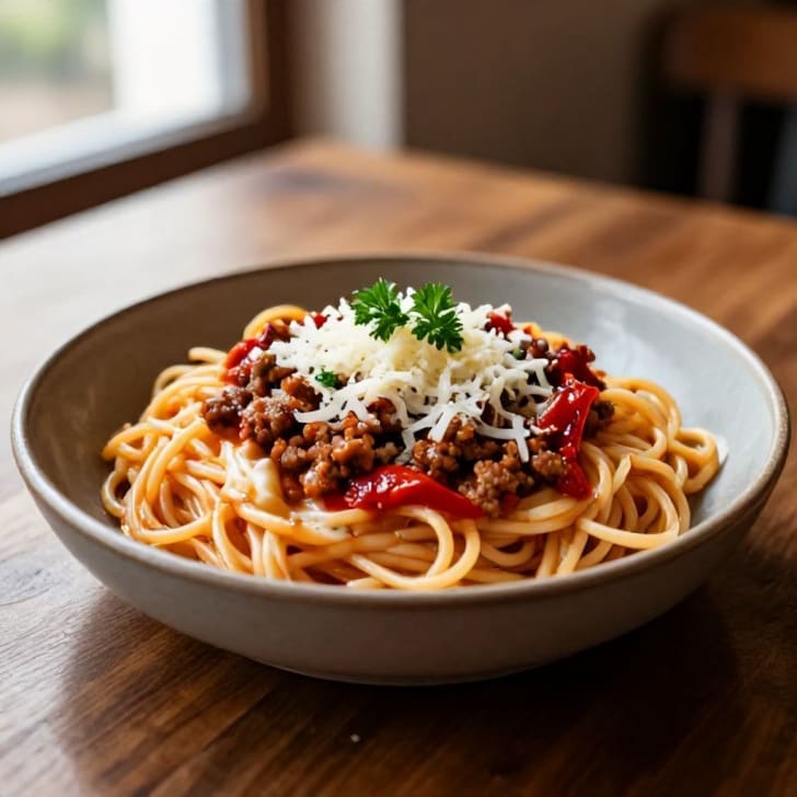 Olivenöl in einer großen Pfanne bei mittlerer Hitze erhitzen. Zwiebel hinzufügen und ca. 3-4 Minuten weich dünsten. Schweinehackfleisch hinzufügen und unter Rühren braten, dabei mit einem Löffel zerdrücken, bis es braun ist. Überschüssiges Fett abgießen.