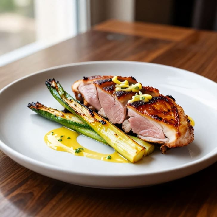 Die Entenbrüste aufschneiden und mit den gerösteten Zucchini servieren, großzügig mit der Zitronen-Kräuter-Butter beträufeln.
