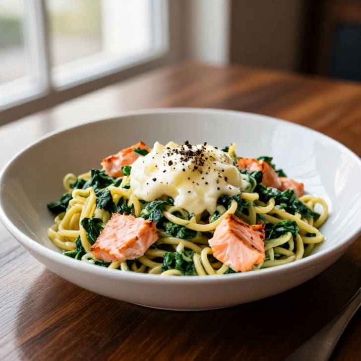 Dieses schnelle und gesunde Abendessen kombiniert zarten Lachs mit cremigem Spinat und al dente Tagliatelle, verfeinert mit einem Hauch geschmolzenem Mozzarella für ein köstliches Abendessen unter der Woche. Der reichhaltige Lachs und der herzhafte Spinat ergeben ein wunderbar ausgewogenes Geschmacksprofil.